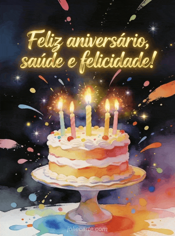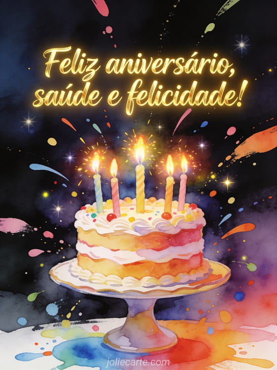 Deseje saúde e felicidade com um cartão vibrante de aniversário em aquarela digital com letras douradas de pincel, respingos luminosos de tinta, velas de aniversário, um bolo decorado e brilho festivo. Você também pode enviar um cartão de cartão de aniversário homem grátis facebook, um cartão de cartão de aniversário homem carro ou um cartão de aniversário homem humor.