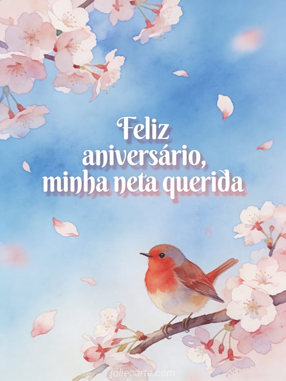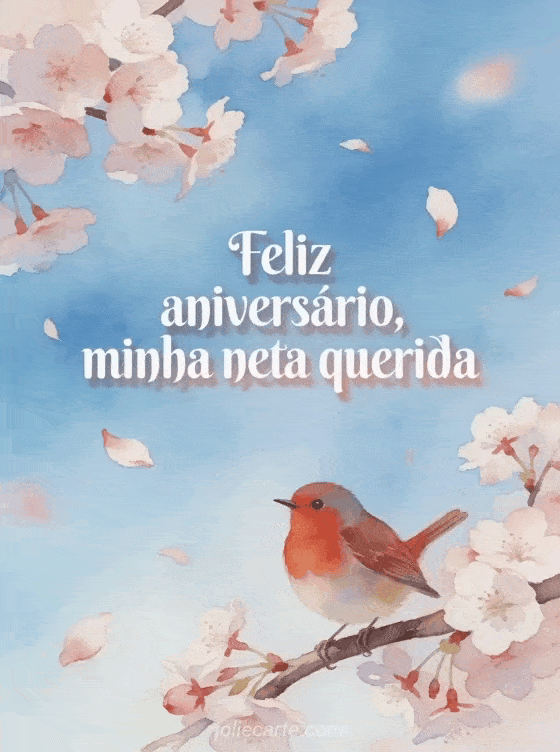Envie um cartão terno de aniversário para sua neta com um pintarroxo adorável pousado em um ramo de cerejeira em flor, pétalas voando na brisa e um céu azul suave. Veja também cartão aniversário neta ou aniversário neta imagem gif.