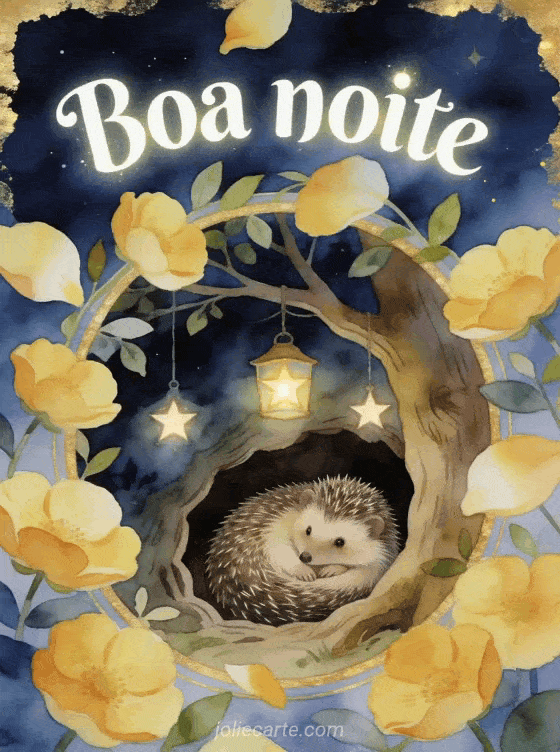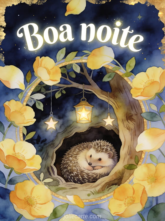 Compartilhe um cartão terno de boa noite com um ouriço enrolado dentro de uma árvore oca, lanternas de estrela e pétalas de ranúnculo sob um céu azul profundo. Você também pode enviar uma bela mensagem boa noite, uma uma mensagem para dizer boa noite ou uma mensagem de boa noite para amiga.
