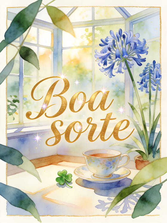 Envie boa sorte com escrita dourada, uma xícara de porcelana, um pequeno amuleto verde da sorte e flores azuis de agapanto em uma varanda ensolarada. Veja também cartão de boa sorte, boa sorte na sua prova texto ou boa sorte gifs animados grátis.