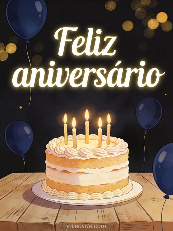 Envie ao homem especial da sua vida um cartão de aniversário grátis. Esta ilustração calorosa mostra um lindo bolo de aniversário com velas acesas sobre uma mesa de madeira rústica, suaves luzes bokeh douradas e balões azul-escuro ao fundo. Um cartão elegante e festivo para fazê-lo sorrir. Descubra também um texto de cartão de aniversário para homem ou um cartão de humor para aniversário de homem.