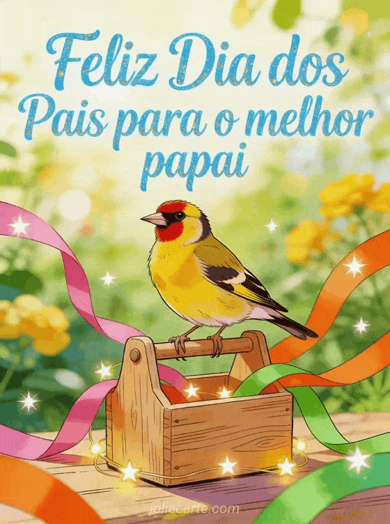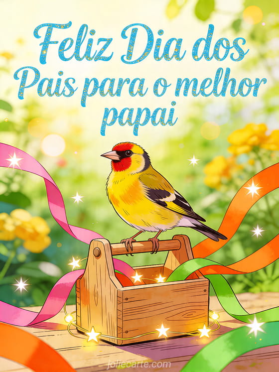 Celebre o melhor papai com um cartão ilustrado e colorido mostrando um pintassilgo pousado em uma pequena caixa de ferramentas de madeira, cercado por fitas brilhantes e luzes em forma de estrela em um jardim ensolarado. É alegre, sincero e fácil de compartilhar. Veja também parabéns dia dos pais, citação curta Dia dos Pais ou cartão feliz dia dos pais papai.