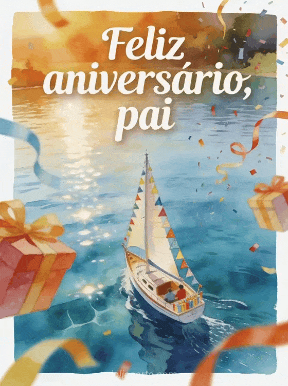 Envie um cartão de feliz aniversário pai com letras marfim em pincel, um veleiro em aquarela decorado com bandeirinhas de aniversário sobre um lago brilhante, fitas e confete saindo pela borda. Veja também um feliz aniversário papai imagens animadas, um poema de aniversário papai criança ou um feliz aniversário papai gif.