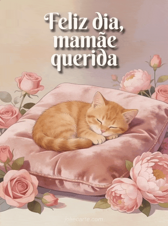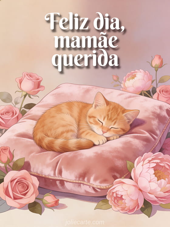 Surpreenda a mamãe com este doce cartão com um adorável gatinho ruivo dormindo entre rosas e peônias. Veja também gif feliz dia das mães ou poema curto para o dia das mães.