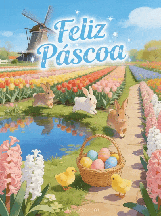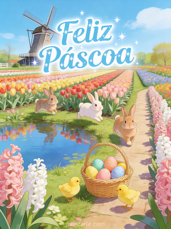 Três adoráveis coelhos brincando entre fileiras de tulipas em flor em Keukenhof, um moinho holandês ao fundo — um maravilhoso cartão de Páscoa grátis para compartilhar. Veja também uma mensagem para desejar Feliz Páscoa, votos feliz Páscoa ou um cartão de feliz festa de Páscoa.