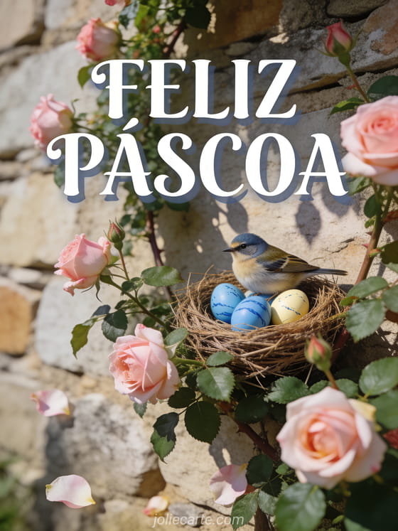 Um ninho aconchegante com um pequeno pardal e ovos marmorados azuis e creme em um rosal trepador rosa em flor — um ternurento e poético cartão de Páscoa. Veja também um texto Feliz Páscoa, um lindo cartão Feliz Páscoa ou um cartão de Páscoa grátis.