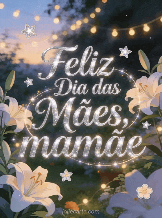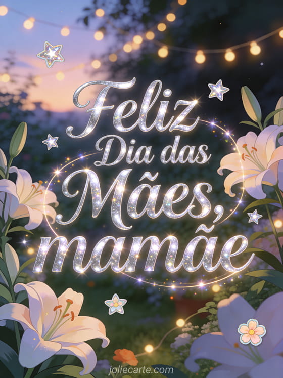 Surpreenda a mamãe com este lindo cartão animado para o dia das mães com escrita prateada e lírios sob luzes de fada. Descubra também uma imagem dia das mães ou um lindo cartão dia das mães.