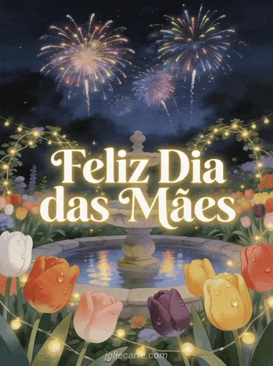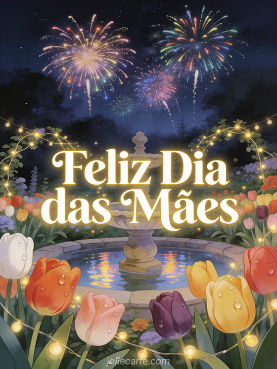 Envie este lindo cartão do Dia das Mães com flores e celebre sua mamãe com um jardim mágico noturno cheio de tulipas vibrantes e fogos de artifício. Veja também um cartão dia das mães mamãe ou um cartão dia das mães original.
