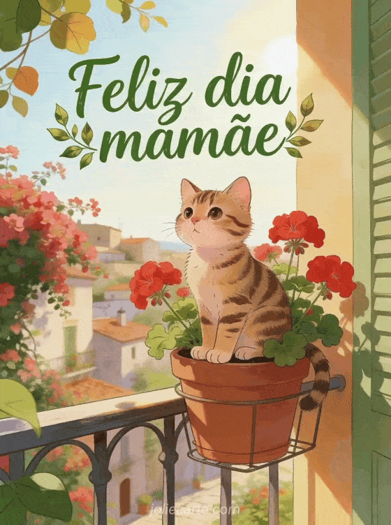 Celebre a mamãe com este alegre cartão de felicitação grátis. Uma encantadora ilustração mostra um gato rajado sentado em um vaso de gerânios vermelhos em uma varanda ensolarada com vista para uma vila mediterrânea, com buganvílias ao fundo. Descubra também um cartão com fotos para o Dia das Mães, um cartão com flores para o Dia das Mães ou um cartão para o Dia das Mães.