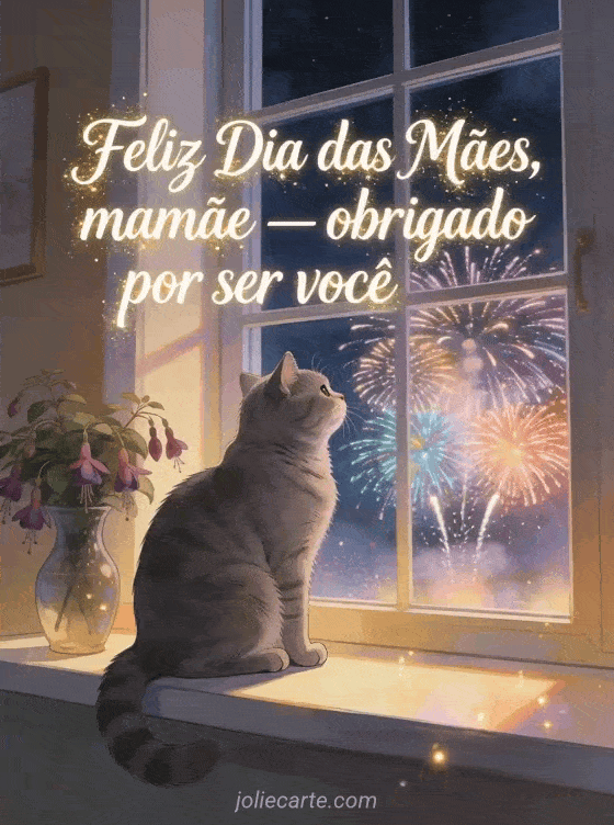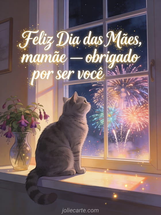 Surpreenda-a com este mágico cartão dia das mães original. Um gato british shorthair cinza senta na janela observando fogos de artifício espetaculares, com um vaso de fúcsias e brilhos dourados. Descubra também um cartão dia das mães grátis ou um texto cartão dia das mães.