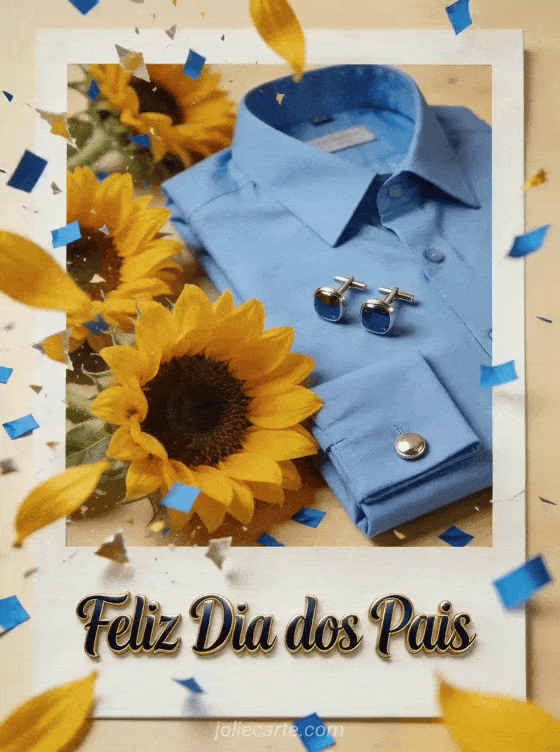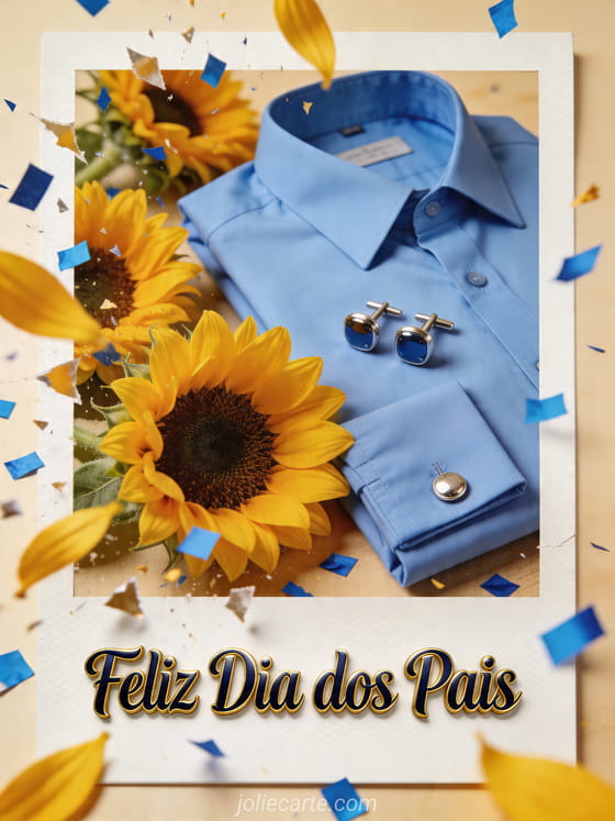 Envie um cartão elegante de Dia dos Pais com camisa com uma camisa social azul-clara dobrada fotorrealista, abotoaduras polidas, girassóis e confetes azuis em luz calorosa de estúdio. Veja também feliz dia dos pais papai, um cartão original de Dia dos Pais ou cartões Dia dos Pais.