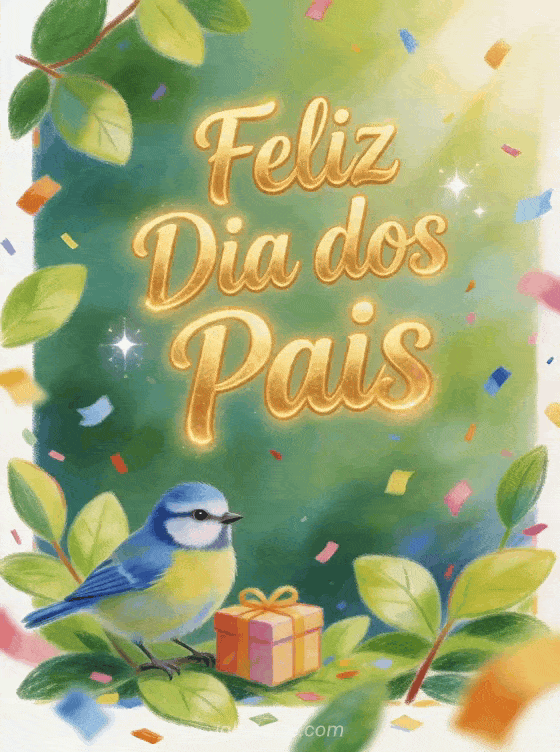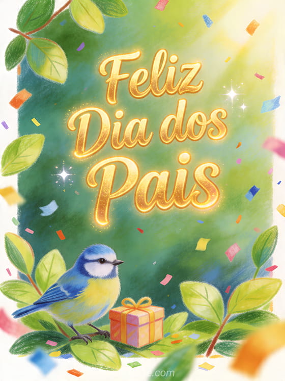 Envie um cartão alegre de Dia dos Pais com uma ilustração em lápis de cor de um chapim-azul pousado ao lado de um pequeno presente embrulhado entre folhas verdes luminosas e confetes coloridos. Veja também bom domingo dia dos pais, palavras carinhosas Dia dos Pais ou um cartão gravata Dia dos Pais.