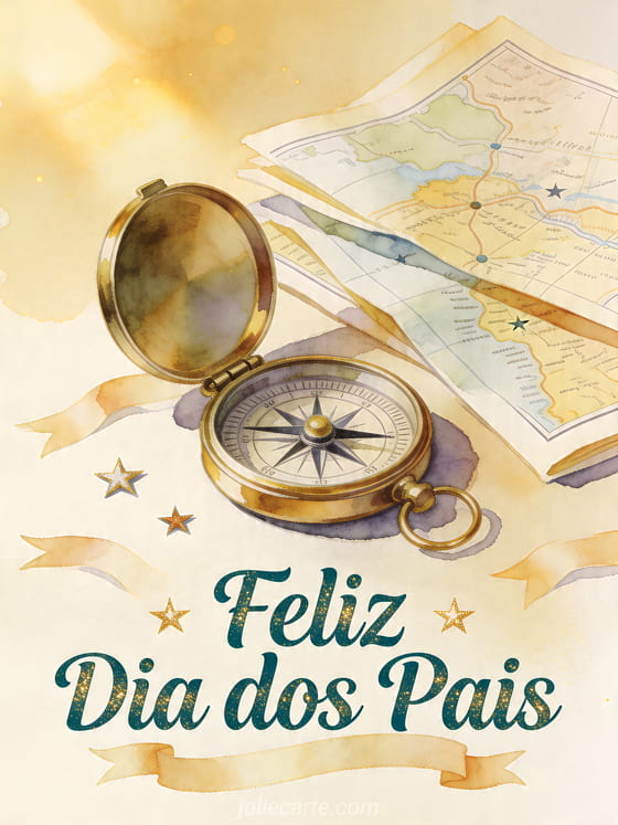 Envie um cartão do Dia dos Pais com caligrafia elegante verde-petróleo, brilho dourado fino e uma bússola em aquarela ao lado de mapas de viagem dobrados, pequenas estrelas e detalhes de fita. Você também pode descobrir um cartão Dia dos Pais, bom domingo dia dos pais ou palavras carinhosas Dia dos Pais.