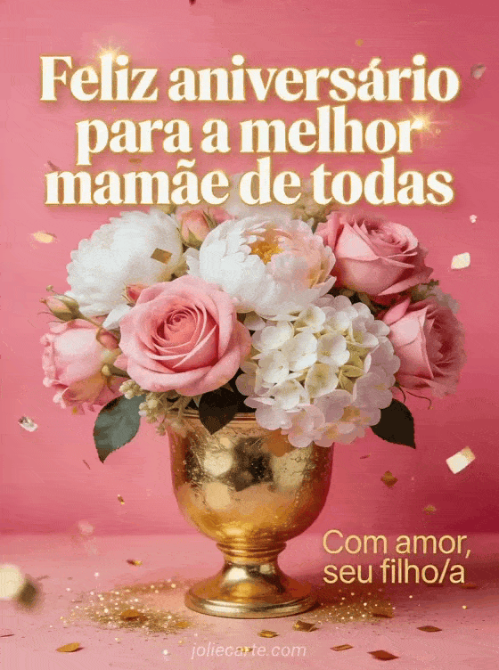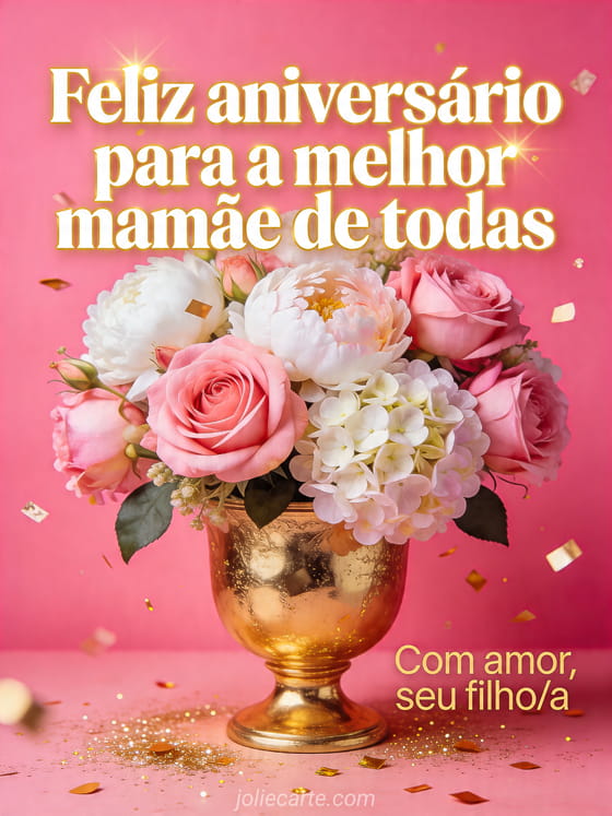 Celebre a mamãe com este elegante cartão de aniversário com rosas cor-de-rosa, peônias brancas, hortênsias e confetes dourados sobre um fundo rosa festivo. Você também pode ver um coração coração feliz aniversário mamãe, um cartão de felicitação aniversário mamãe ou um feliz aniversário mamãe.