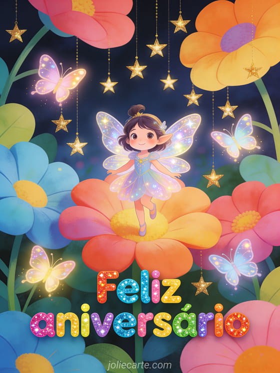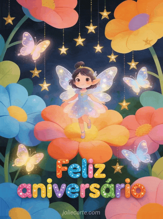 Compartilhe uma mensagem encantada com este cartão brilhante cheio de flores, borboletas e estrelas. Você também pode ver votos de aniversario para minha filha, cartão animado de aniversário para minha filha ou melhores votos de aniversário para minha filha.