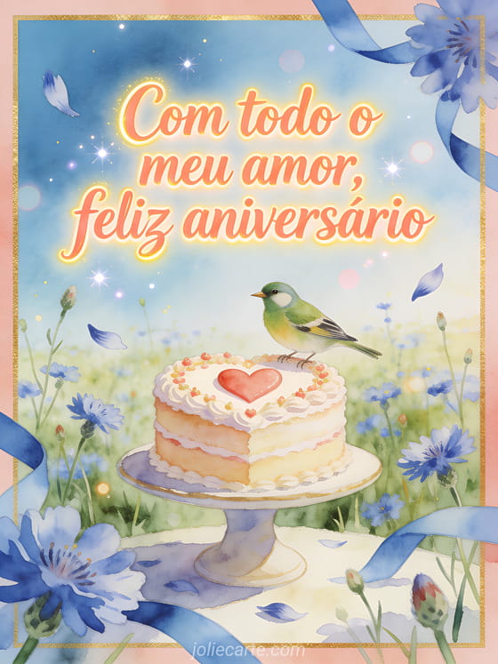 Envie todo o seu amor com um cartão de aniversário em aquarela em um campo de centáureas, com um bolo decorado com coração, fitas azuis, bokeh brilhante e um verdilhão pousado no suporte do bolo. Personalize online e compartilhe grátis. Veja também uma feliz aniversário minha querida imagem, um gif animado feliz aniversário meu coração ou mensagens de aniversário para meu amor.