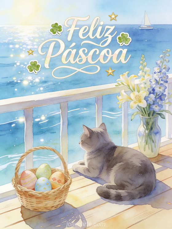 Compartilhe a serenidade da Páscoa com este cartão elegante: um gato chartreux tomando sol numa varanda com vista para o mar azul, uma cesta de ovos de Páscoa e delfínios numa jarra. Descubra também uma flores de Páscoa imagens ou um Feliz Páscoa gif.