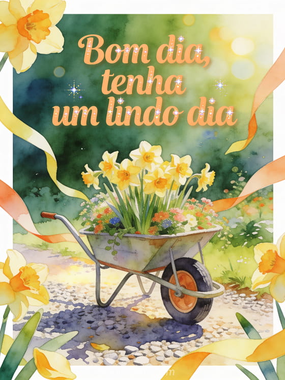 Envie um cartão floral de bom dia com letras damasco alegres em aquarela, um carrinho de jardim cheio de flores, narcisos, um caminho ensolarado de cascalho e fitas brilhantes. Veja também belo cartão virtual gratuito de bom dia, cartões virtuais gratuitos de bom dia ou bom dia e melhores votos.