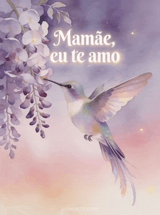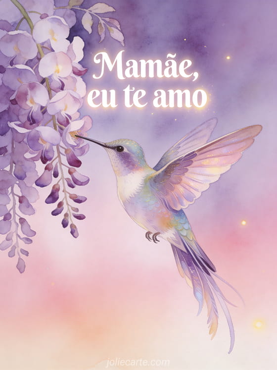 Surpreenda a mamãe com este encantador cartão grátis com um beija-flor iridescente entre glicínias em cascata. Veja também cartão de mãe grátis ou cartão dia das mães original especial.