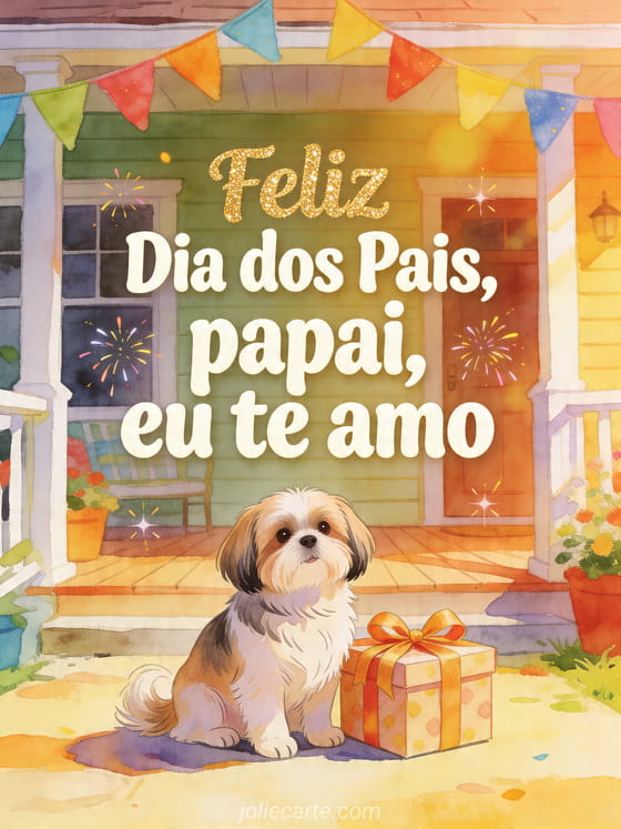 Envie um cartão gratuito de Dia dos Pais com letras marfim arredondadas, brilho dourado suave e uma ilustração em guache de um shih tzu ao lado de uma caixa de presente com fita em uma varanda ensolarada com guirlanda colorida. Você também pode descobrir feliz Dia dos Pais papai imagem, palavras doces para dia dos pais ou feliz Dia dos Pais meu filho.