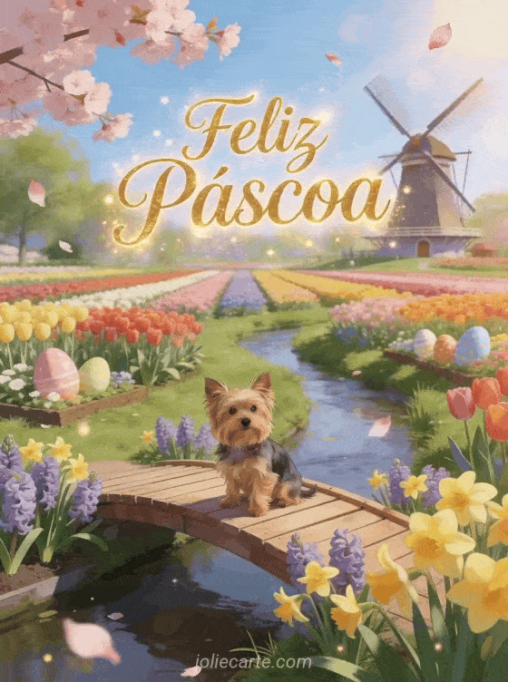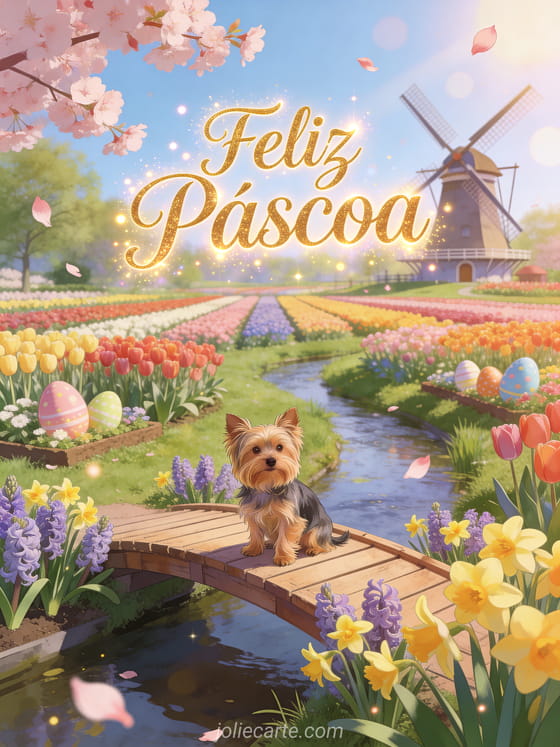 Celebre a Páscoa com este encantador cartão animado gratuito com um Yorkshire Terrier em uma ponte de madeira sobre um riacho ladeado de jacintos e narcisos em Keukenhof com tulipas multicoloridas, um moinho holandês e pétalas de cerejeira. Descubra também cartes de joyeuses fetes de paques texte carte de voeux pâques.