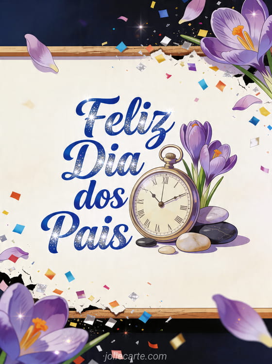 Envie um cartão gratuito Dia dos Pais com texto azul-real nítido, um relógio de bolso ilustrado ao lado de crocus frescos, pedras polidas e confete festivo sob uma luz de celebração. Veja também dia dos pais para meu filho, um cartão de Dia dos Pais PS ou parabéns dia dos pais.