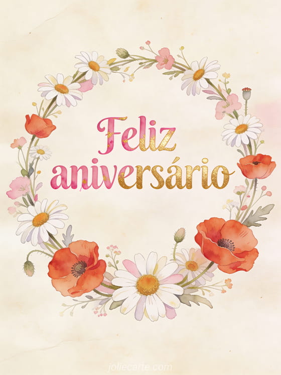 Surpreenda-a com este delicado cartão de aniversário com uma coroa de flores campestres em aquarela rosa e dourada. Descubra também um gif feliz aniversário mulher, um gif aniversário mulher humor ou um gif feliz aniversário mulher.