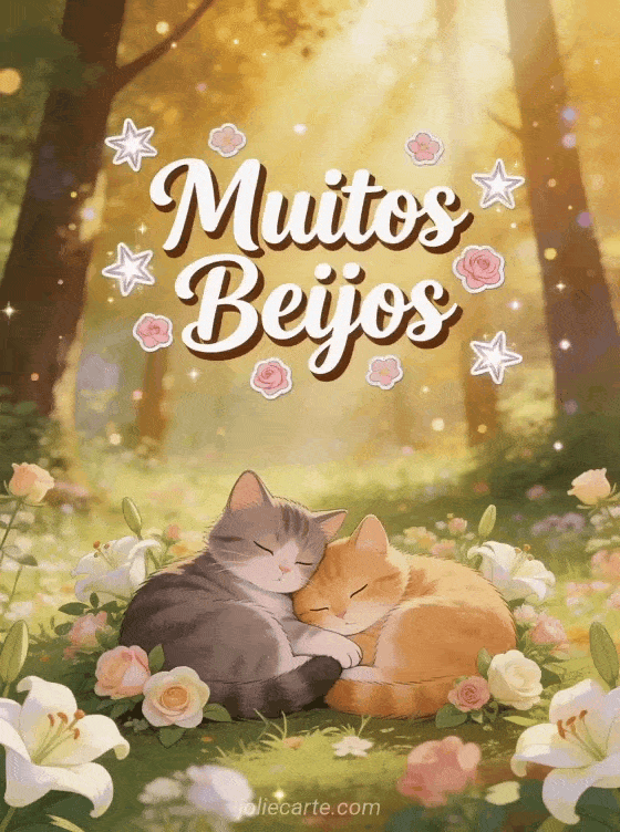 Compartilhe o amor com este adorável cartão de muitos beijos com dois gatos abraçados numa clareira florida. Descubra também beijinhos ternos animados ou beijos clipart grátis.