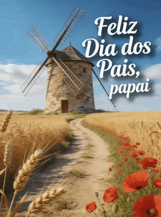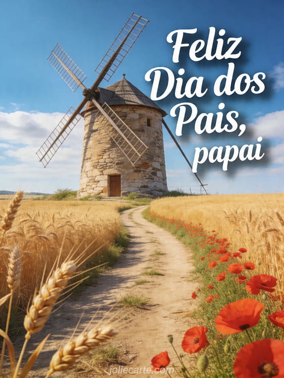 Envie um cartão para Dia dos Pais com um caminho rural entre campos de trigo dourado levando a um velho moinho de pedra, papoulas vermelhas à beira do caminho e luz quente de verão. Você também pode descobrir feliz dia para o papai, um cartão para dia dos pais ou um poema de Dia dos Pais meu coração me diz.
