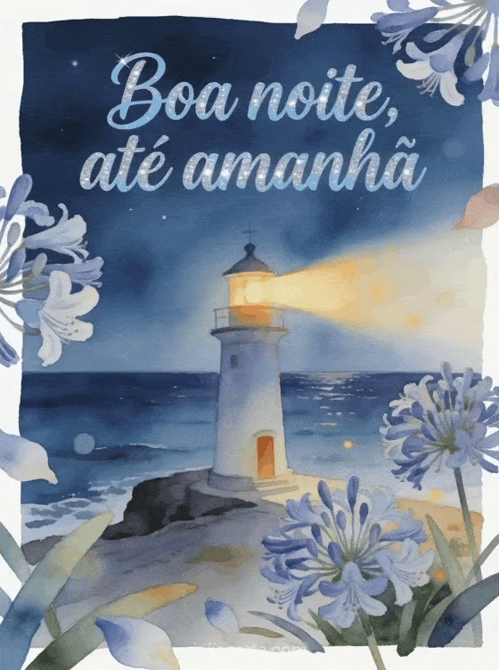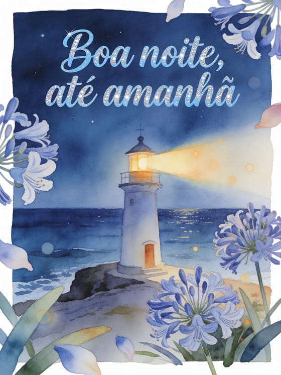 Diga boa noite e até amanhã com um farol em aquarela que lança um feixe quente sobre um mar noturno calmo e flores de agapanto em primeiro plano. Veja também um cartão virtual animado boa noite, um cartão animado de boa noite ou uma mensagem para dizer boa noite.
