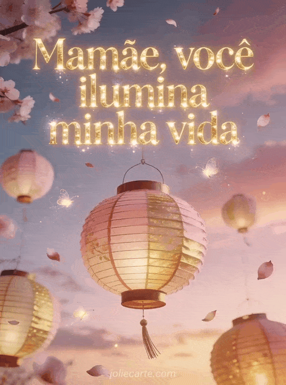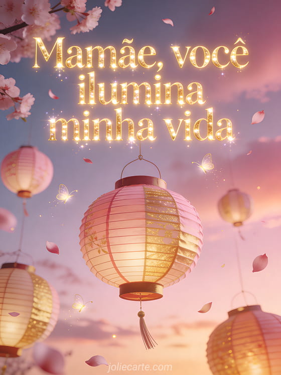 Celebre a mamãe com este encantador cartão para o dia das mães com letras douradas brilhantes, lanternas flutuantes e pétalas de cerejeira. Veja também lindo cartão dia das mães ou modelo de cartão para dia das mães.