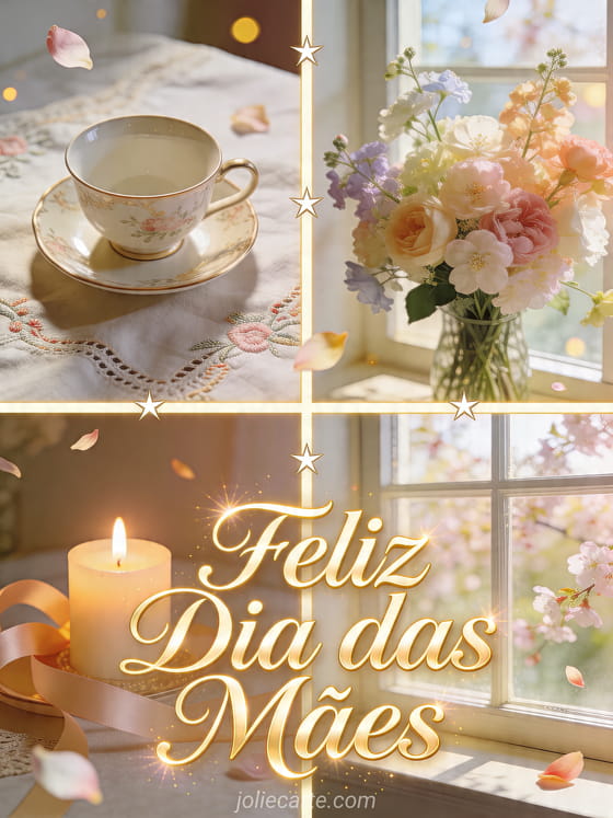 Compartilhe um cartão refinado de Dia das Mães em colagem de quatro painéis, com xícara de porcelana, buquê pastel, vela brilhante e pétalas flutuantes. Veja também imagens grátis Dia das Mães, mensagens de Feliz Dia das Mães ou imagens para o Dia das Mães.