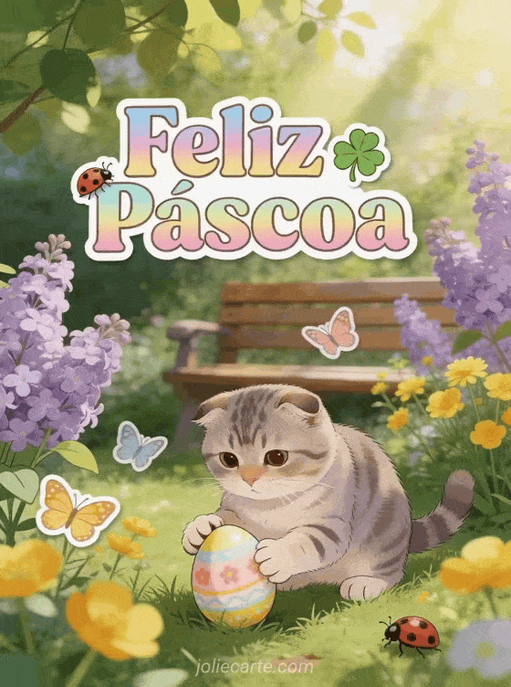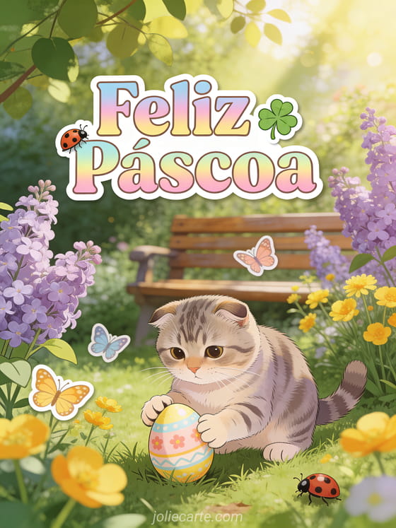 Um gato Scottish Fold brincando com um ovo de Páscoa decorado entre lilases e ranúnculos em um jardim de primavera — um alegre cartão de Páscoa grátis. Veja também um cartão de Páscoa, um texto Feliz Páscoa ou um gif beijos Páscoa.