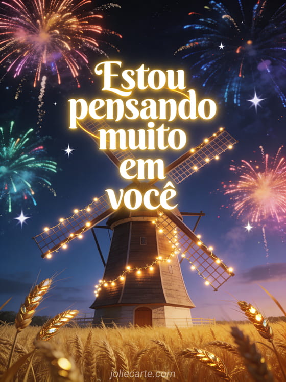 Compartilhe este festivo cartĂŁo com um moinho entre campos de trigo dourado sob um cĂ©u de fogos de artifĂcio. Descubra tambĂ©m uma imagem grĂĄtis pensando em vocĂȘ ou enviar mensagem pensando em vocĂȘ.
