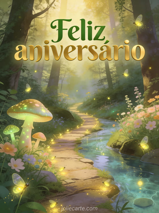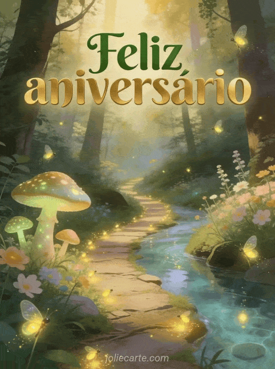 Surpreenda seus entes queridos com este cartão virtual de aniversário animado com um caminho de floresta encantada com vagalumes luminosos e cogumelos mágicos. Descubra também um cartão aniversário animado dromedário musical grátis ou cartões de aniversário animados grátis para mais opções.