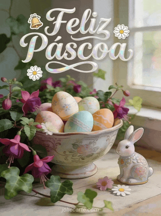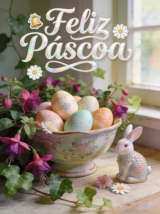 Compartilhe a alegria da Páscoa com este elegante cartão virtual: uma natureza-morta primaveril nostálgica com ovos de Páscoa pintados à mão, fúcsia e margaridas numa tigela vintage junto a um coelhinho decorativo. Descubra também um texto de cartão de Páscoa ou uma Feliz Páscoa GIFs animados grátis.