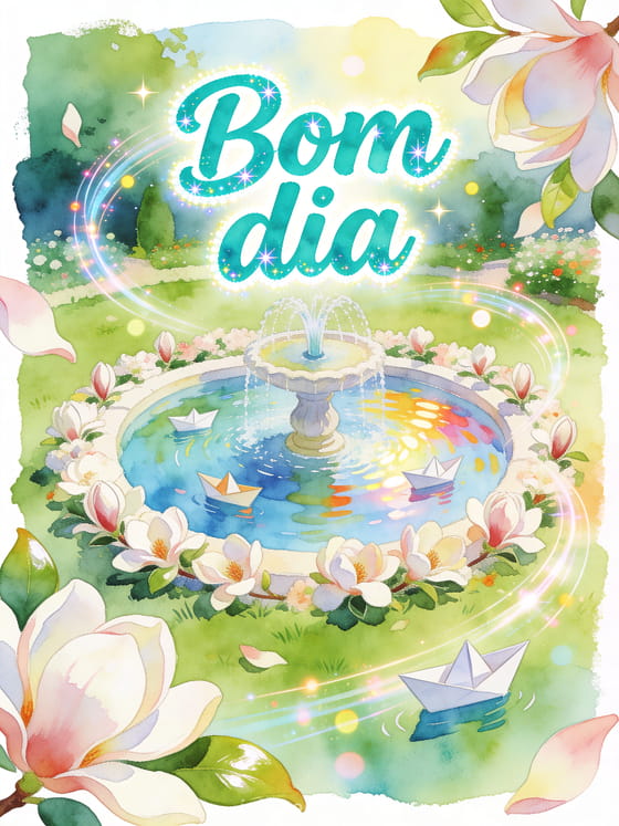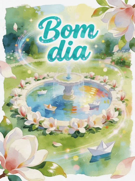 Envie cartões animados de bom dia com letras turquesa vibrantes em aquarela, uma fonte divertida de jardim, magnólias e barcos de papel flutuando. Veja também cartão virtual de bom dia para você, mensagem de bom dia de manhã para pessoa especial ou mensagem de bom dia para seu crush.