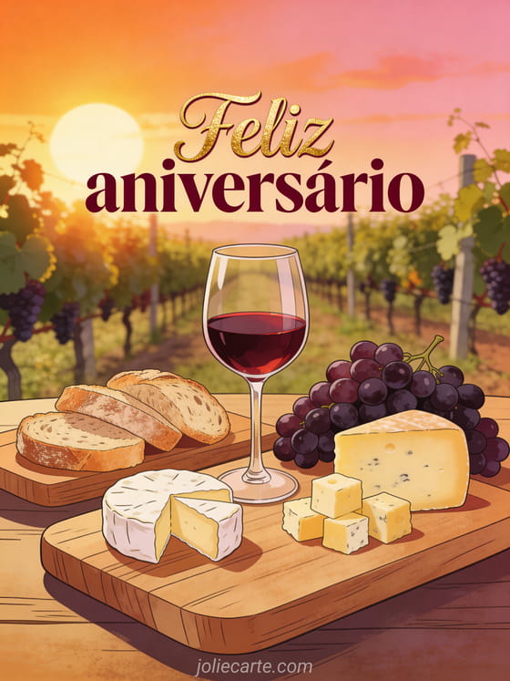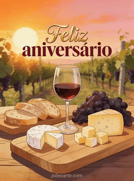 Comemore com um cartão animado de aniversário para adultos com vinho, uvas, queijo e vinhedo dourado ao pôr do sol. Veja também cartões aniversário animados grátis dromadaire, dromadaire cartões aniversário animados e feliz aniversário gato animado.
