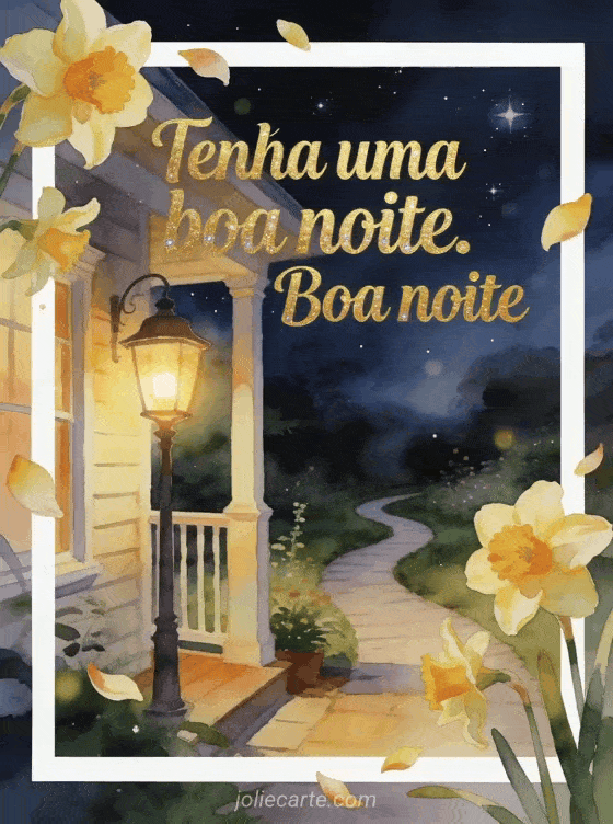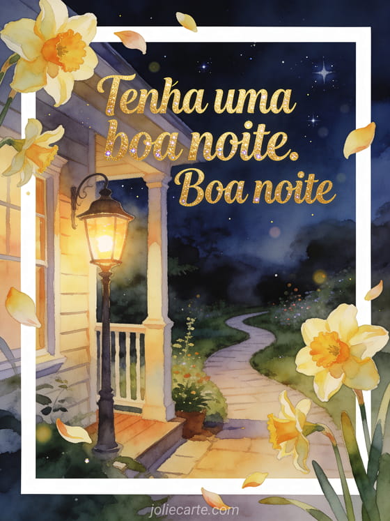 Compartilhe tenha uma boa noite com um cartão em aquarela que mostra um caminho de jardim, uma lanterna de varanda acesa, narcisos e as primeiras estrelas. Veja também um cartão de desejos de boa noite, cartões virtuais animados grátis de boa noite ou magnífica mensagem de boa noite.