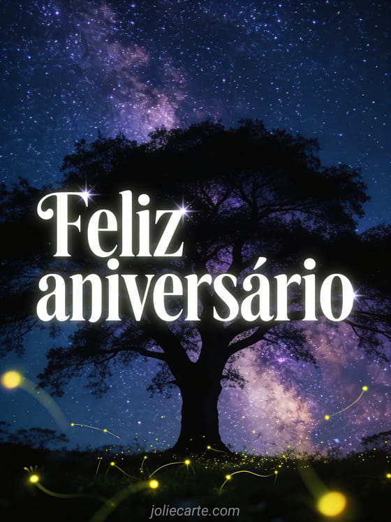 Compartilhe um deslumbrante cartão animado de aniversário com um céu noturno estrelado, a Via Láctea e vagalumes brilhantes em torno da silhueta de uma árvore majestosa. Descubra também aniversário flores animadas ou cartão animado aniversário grátis.