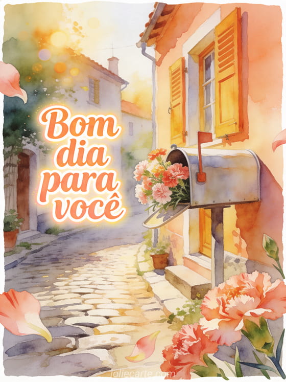 Envie cartões de bom dia gratuitos com letras pêssego quentes em aquarela, uma caixa de correio ensolarada de vilarejo cheia de cravos, uma rua de paralelepípedos e venezianas pintadas de cores vivas. Veja também mensagem bom dia imagem, cartões de bom dia para amigos ou mensagem de bom dia para minha esposa.