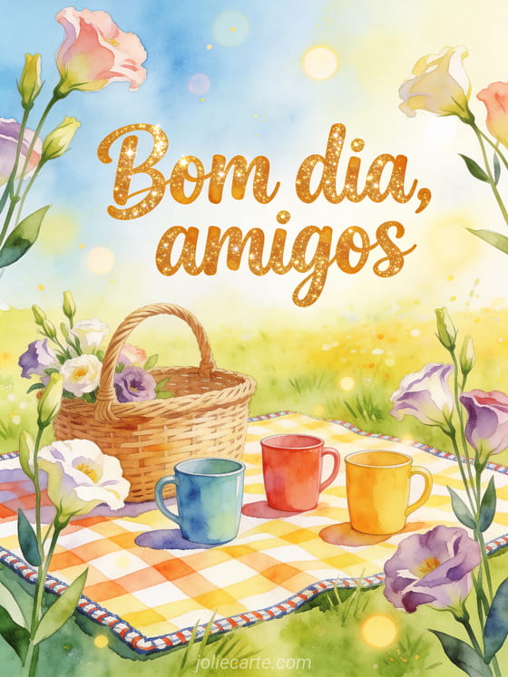 Envie cartões de bom dia para amigos com letras alegres e marcantes em aquarela, três canecas coloridas, uma cesta de piquenique trançada e lisiantos ao redor de uma toalha de mesa xadrez luminosa. Veja também mensagem de bom dia para minha esposa, mensagem bonita de bom dia ou mensagem fofa de bom dia com carinho de manhã.