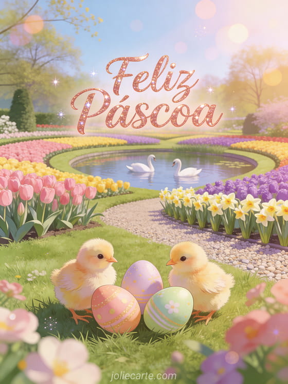 Celebre a Páscoa com este encantador cartão animado gratuito com dois adoráveis pintinhos ao lado de ovos de Páscoa pintados em um gramado de Keukenhof com canteiros geométricos de tulipas em rosa, amarelo e roxo, cisnes em um lago e narcisos. Descubra também texte carte de voeux pâques jolie carte animée de paques.