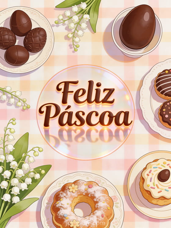 Envie um cartão de Páscoa encantador com uma mesa decorada de ovos de chocolate e petit-fours. Descubra também uma mensagem feliz Páscoa ou um feliz Páscoa gif animado.