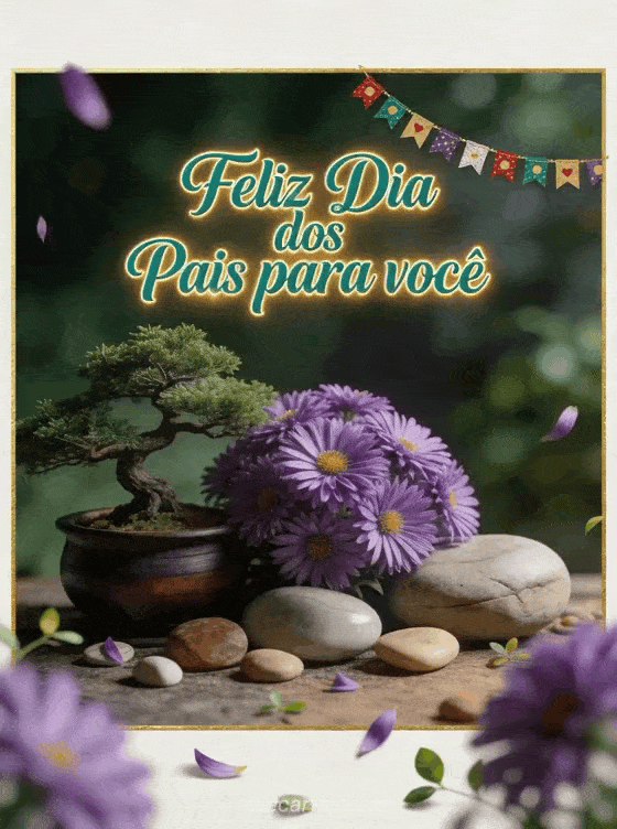 Envie cartões Dia dos Pais com escrita esmeralda confiante, um bonsai realista ao lado de ásteres roxos, pedras cerâmicas lisas e uma pequena guirlanda festiva em uma atmosfera serena e alegre. Veja também feliz Dia dos Pais papai texto, feliz dia das mães mamãe e feliz dia dos pais papai ou um cartão grátis feliz dia dos pais.