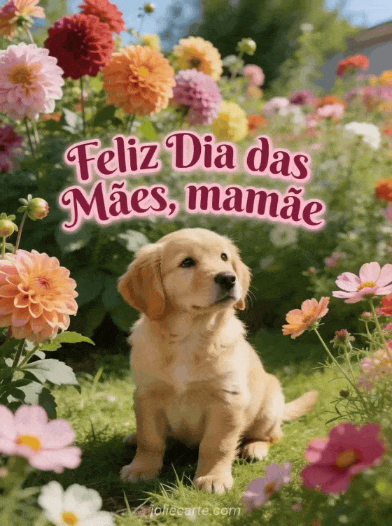 Compartilhe este alegre cartão do dia das mães grátis. Um filhote de golden retriever senta em um jardim de dálias multicoloridas e cosmos, olhando ternamente com grama verde luminosa. Descubra também uma imagem feliz domingo dia das mães ou uma imagem dia das mães grátis.