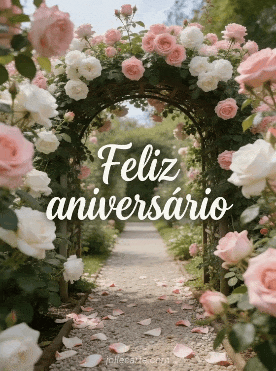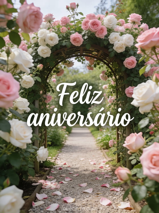 Encante-a com este cartão de aniversário com um arco de jardim coberto de rosas em plena floração. Descubra também um mensagem feliz aniversário mulher ou um cartão aniversário mulher natureza.