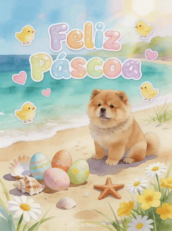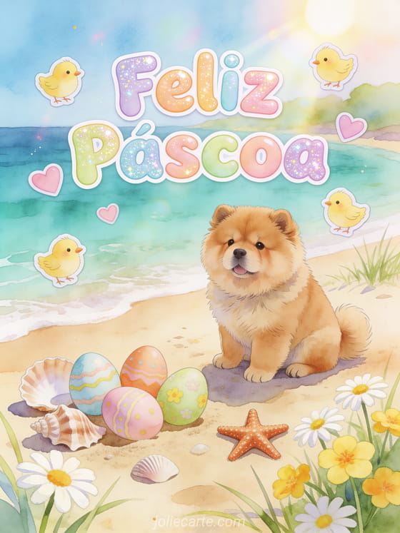 Envie estes cartoes gratis de feliz Pascoa com um adoravel filhote de chow-chow em uma praia de areia com aguas turquesas, ovos de Pascoa coloridos entre conchas e estrelas do mar, e margaridas primaveris. Uma cena calorosa em aquarela. Descubra tambem um cartao de Pascoa, um cartao de felicitacoes de Pascoa ou um cartao de Pascoa gratis.