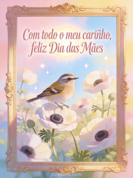 Compartilhe um cartão delicado de Dia das Mães em estilo de livro de histórias, com lettering rosado, uma felosa entre anêmonas frescas, uma borda dourada ornamentada e luz clara da manhã. Veja também feliz Dia das Mães para minha mamãe, um poema curto para o Dia das Mães ou imagens gratuitas do Dia das Mães.