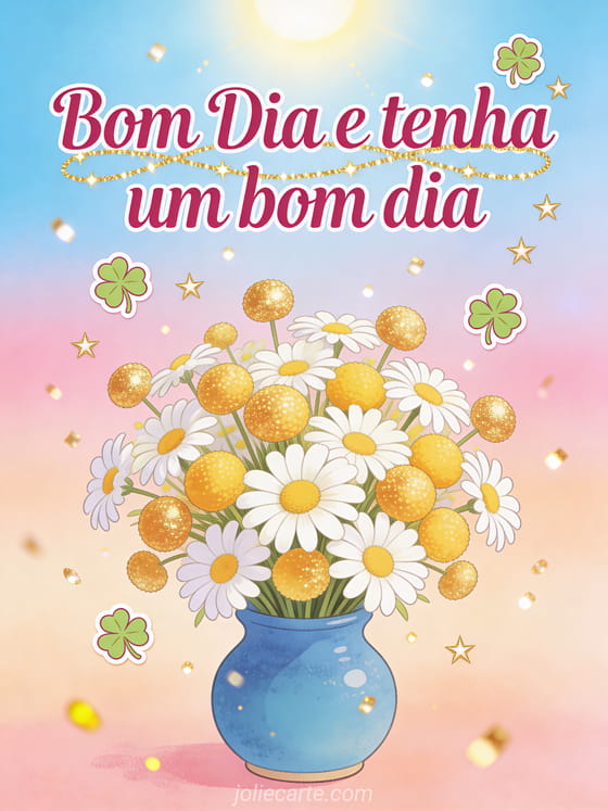 Comece o dia com este luminoso cartão com um buquê de botões-de-ouro e margaridas em um vaso azul, trevos de quatro folhas, céu azul radiante e brilhos dourados. Descubra também um cartão de bom dia com beijos ou um cartão animado de bom dia.